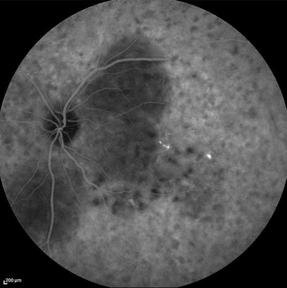 急性期の原田病症例におけるIA後期像。散在する斑状低蛍光がみられる。