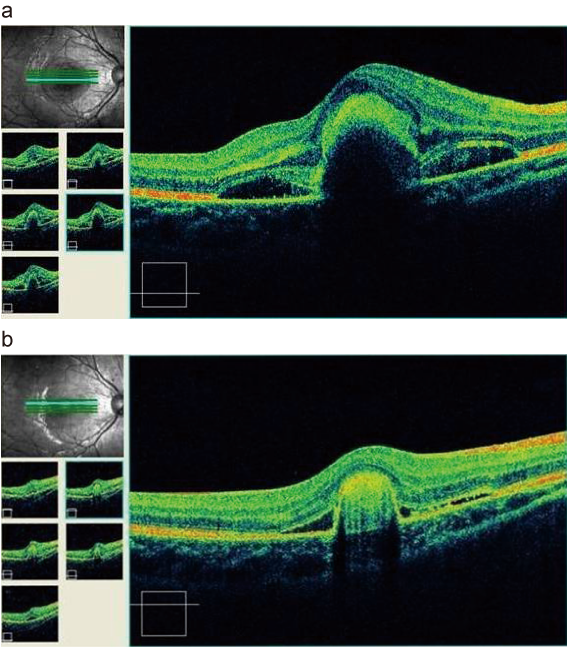 b:治療後。CNVは退縮し網膜下液も改善している。