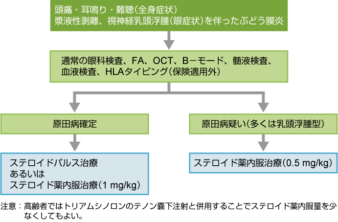 原田病の診断および治療の手順について簡単にまとめたものを示す。治療については患者の全身状態を考慮に決定することが望ましい。