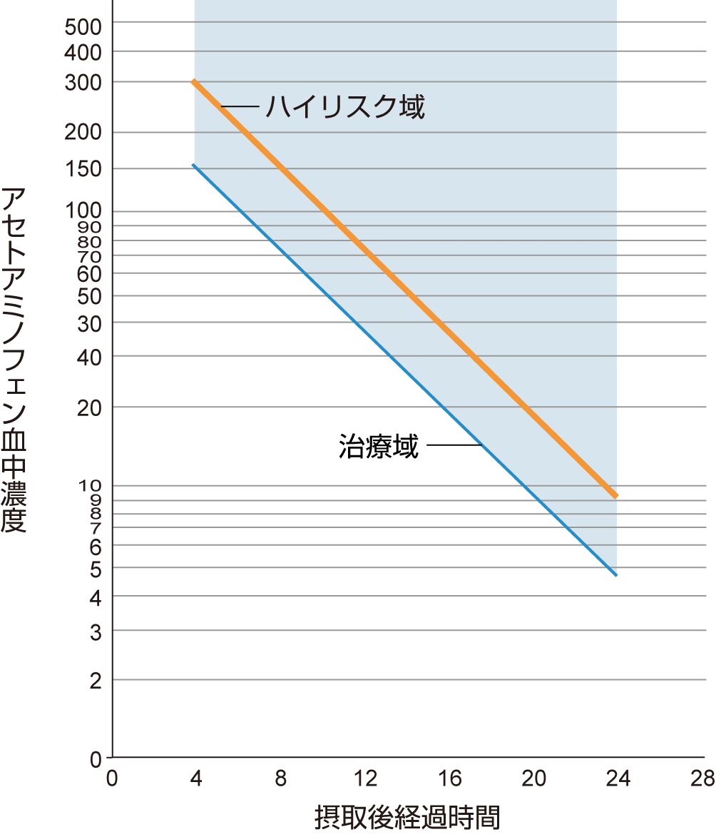 4時間後に300μg/mLから始まる線は、元のノモグラム線よりも50%高い値として導出され、肝障害の発症リスクが高い患者を識別するために使用される。