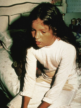 顔面浮腫と眼瞼の皮下出血。結膜下出血も認められる。
