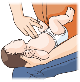 乳児の顔を下に向けてうつ伏せにし、胸部を救助者の大腿の上に置いた前腕で支える。肩甲骨間を手の付け根で叩く。頭部と下顎を手でしっかり支え、喉を圧迫しないよう気を付ける。