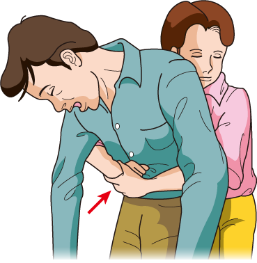 傷病者の背後から、傷病者の腹部に腕を回す。片手で握りこぶしを作り、もう一方の手で握る。胸骨から十分下の臍のやや上にそれを押し込み、力を込めて上に突き上げる。