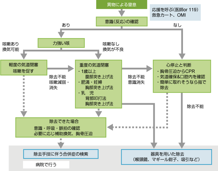 患者に意識があり呼吸が維持できていれば、異物の場所と形態を診断し、専門医へコンサルトする。