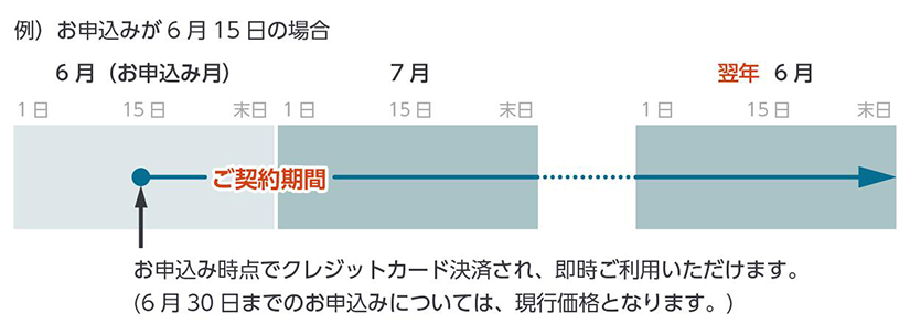 お申込み日が契約開始日で、翌年のお申込み月末日までが初年度の契約期間となります。